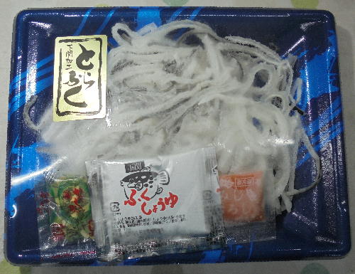 寒くなってくるとふぐが 恋しくなりますね。 とらふぐの皮の湯引です。 ふぐ醤油、ねぎ、もみじおろし。 でお召し上がりください。 税込特価350円でサ-ビス。 |